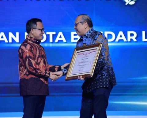 Sekretaris Jenderal (Sekjen) Kementerian Agraria dan Tata Ruang/Badan Pertanahan Nasional (ATR/BPN), Suyus Windayana mewakili Menteri ATR/Kepala BPN, Agus Harimurti Yudhoyono (AHY) menerima penghargaan kategori